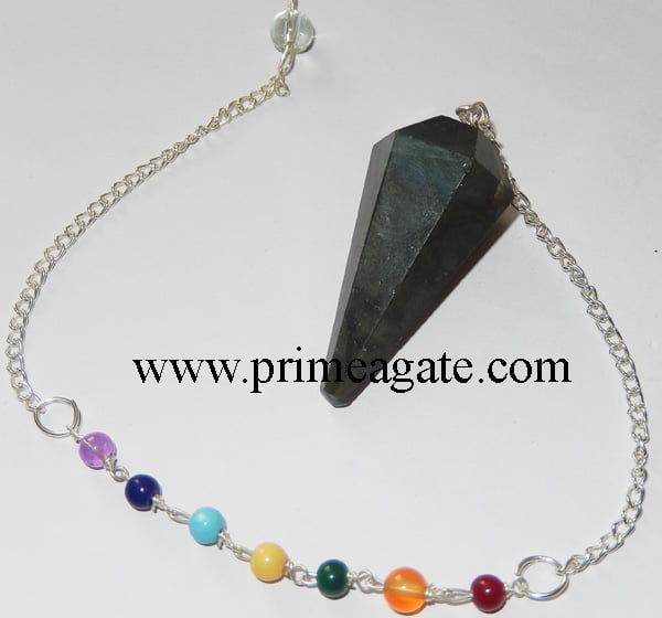 Labradorite Chakra Pendulum: This pendulum features a stunning Labradorite gemstone and 7 chakra beads, each in a different color. Labradorite is believed to enhance intuition and inner peace, making this pendulum a great tool for spiritual healing and divination.