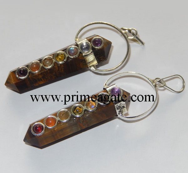 Tiger Eye Double Point Chakra Pendant: This pendant features a double point design and is made of tiger eye, a stone that is said to bring protection and grounding. The pendant represents the chakra system and is believed to bring balance and harmony to the wearer.
